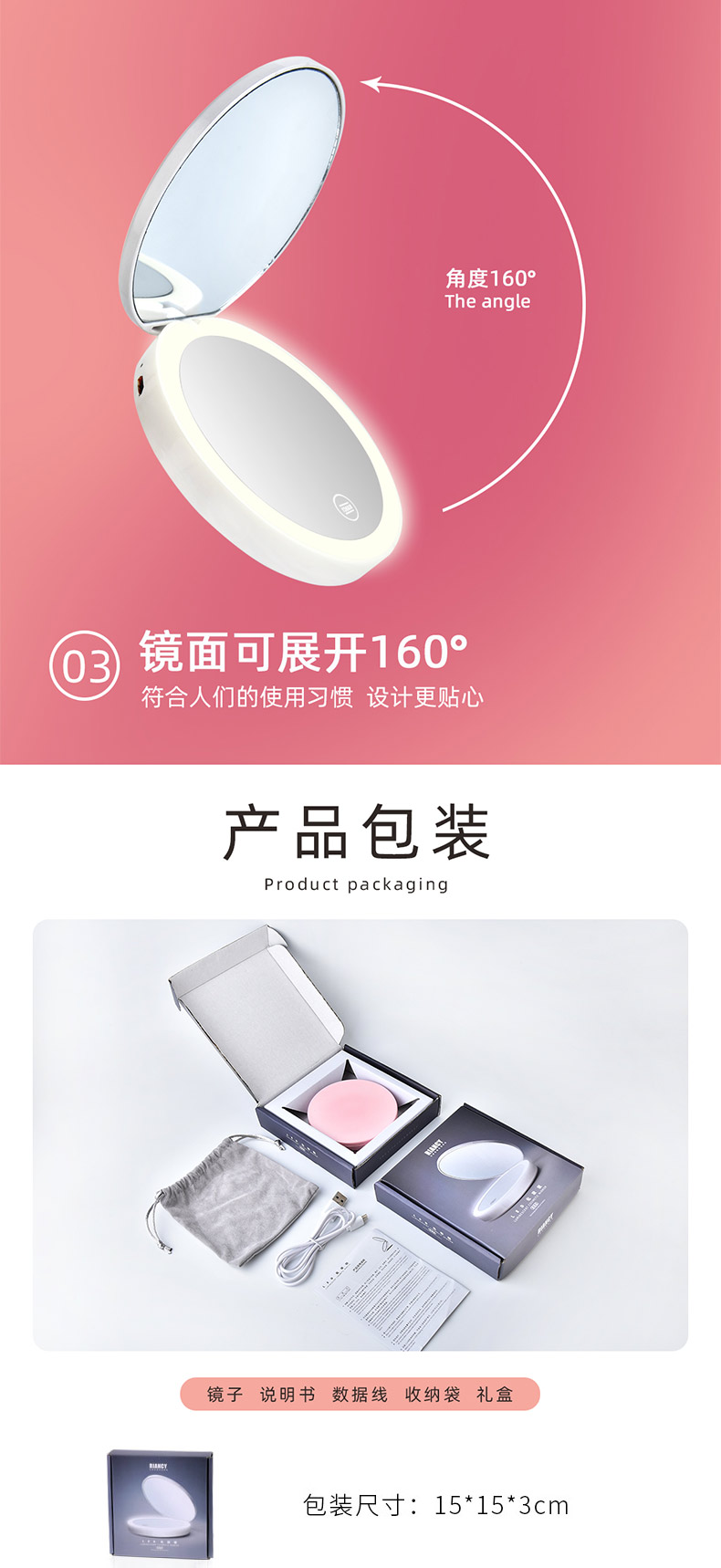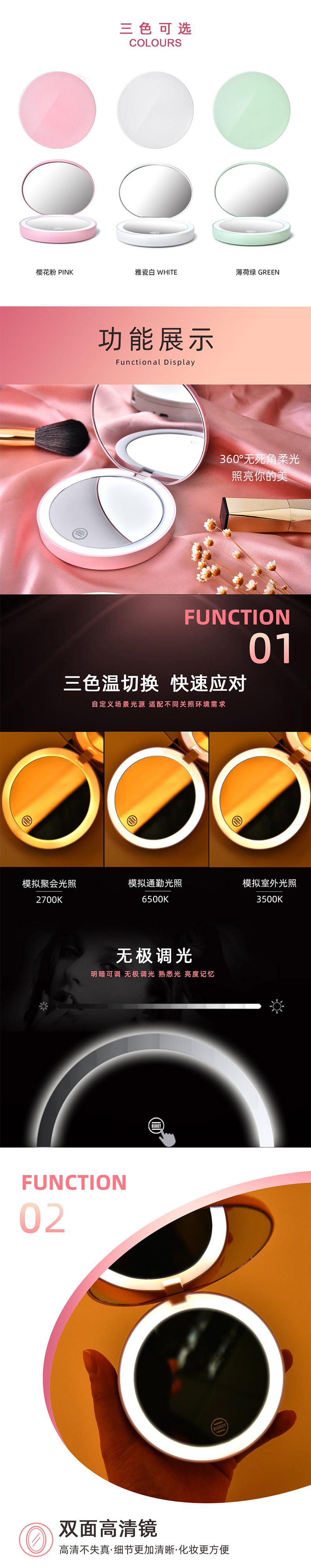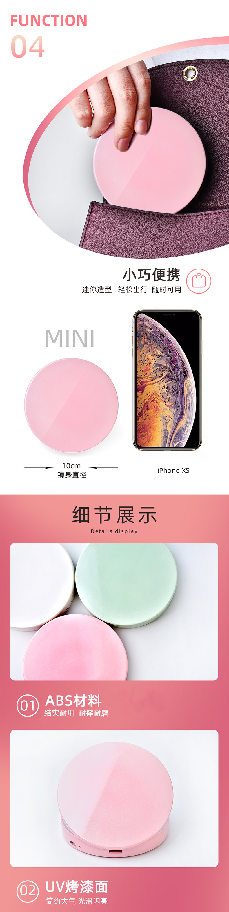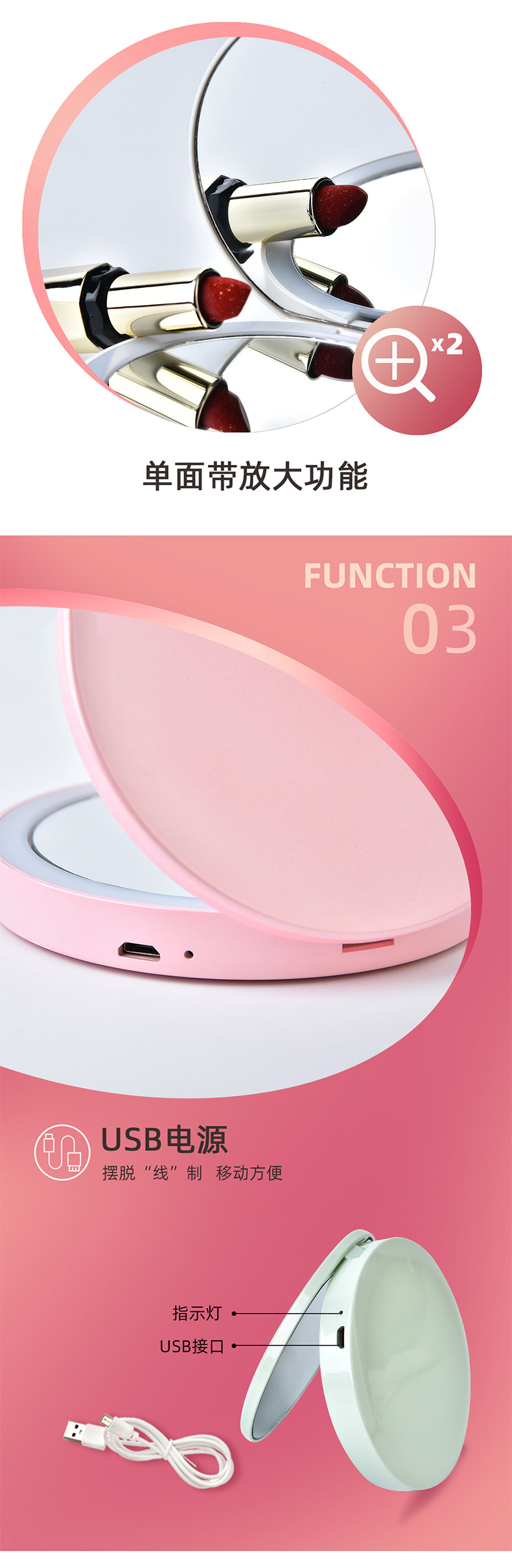 商品名称:充电式UV烤漆便携LED化妆圆镜 双面高清梳妆镜--粉色(B-500)创意女性小礼品
