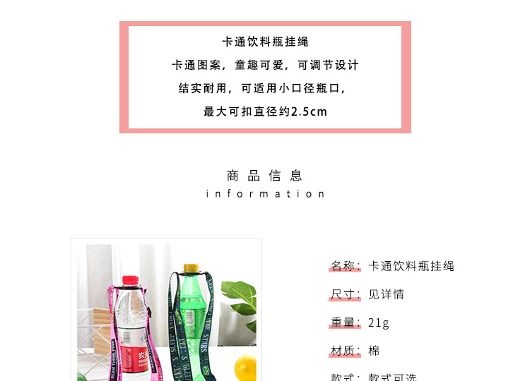 商品名称:卡通饮料挂绳 背挂式可调节适用广泛 适用于小口径瓶子