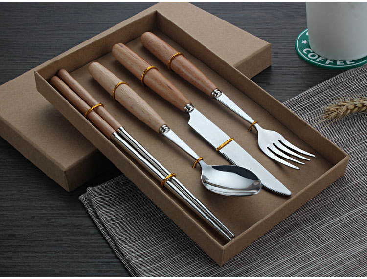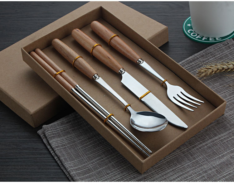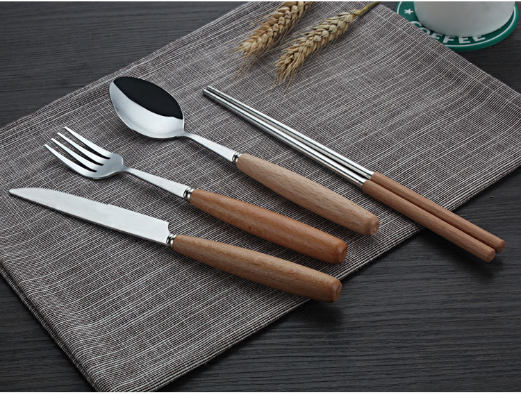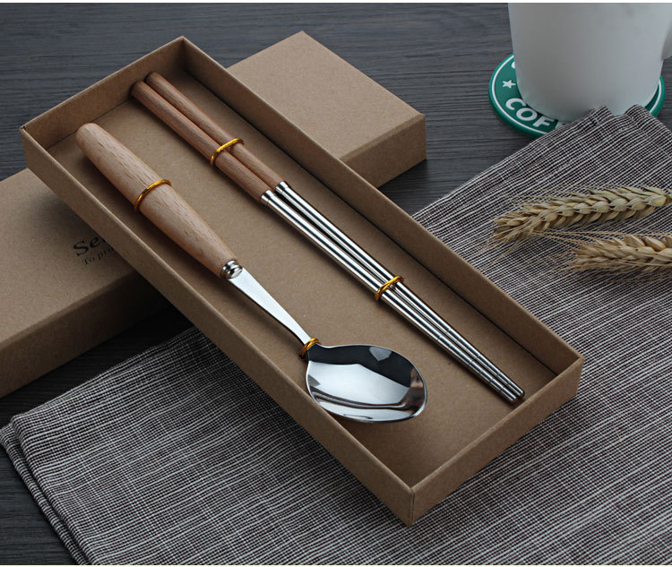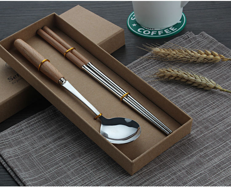 原木不锈钢西餐具套装 榉木柄勺子、筷子两件套(圆勺)