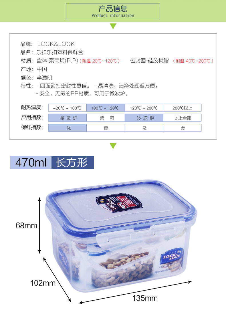 商品名称:乐扣乐扣(Lock&Lock)塑料保鲜盒 微波炉饭盒 便当盒 密封盒收纳盒470ML HPL807