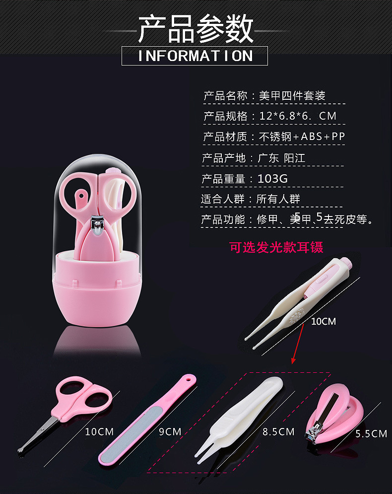 商品名称:婴儿指甲剪不锈钢套装 儿童宝宝安全美甲4件套 送妈妈小礼品 2周岁宝宝礼品赠送