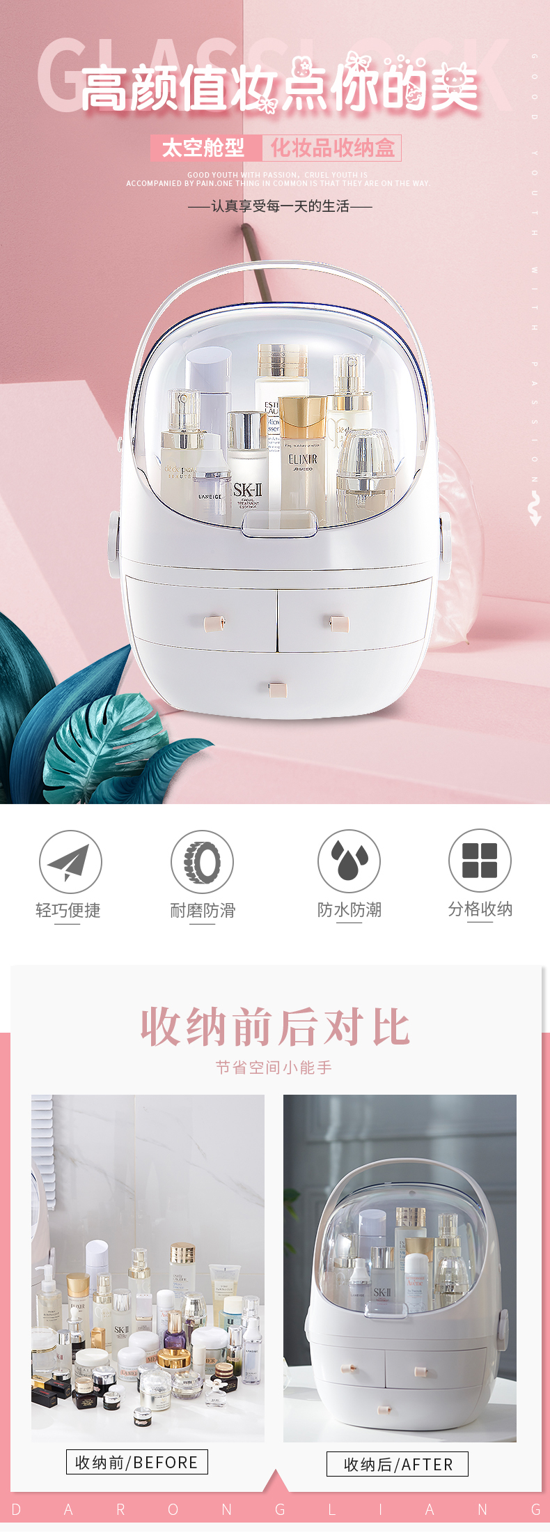 太空舱造型可手提双开门带盖大小抽屉化妆品收纳盒--珍珠白(1952) 三八妇女节发什么好