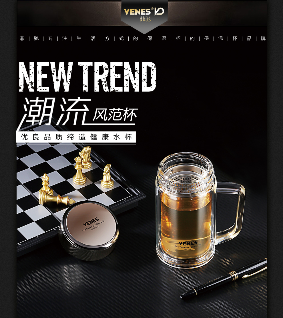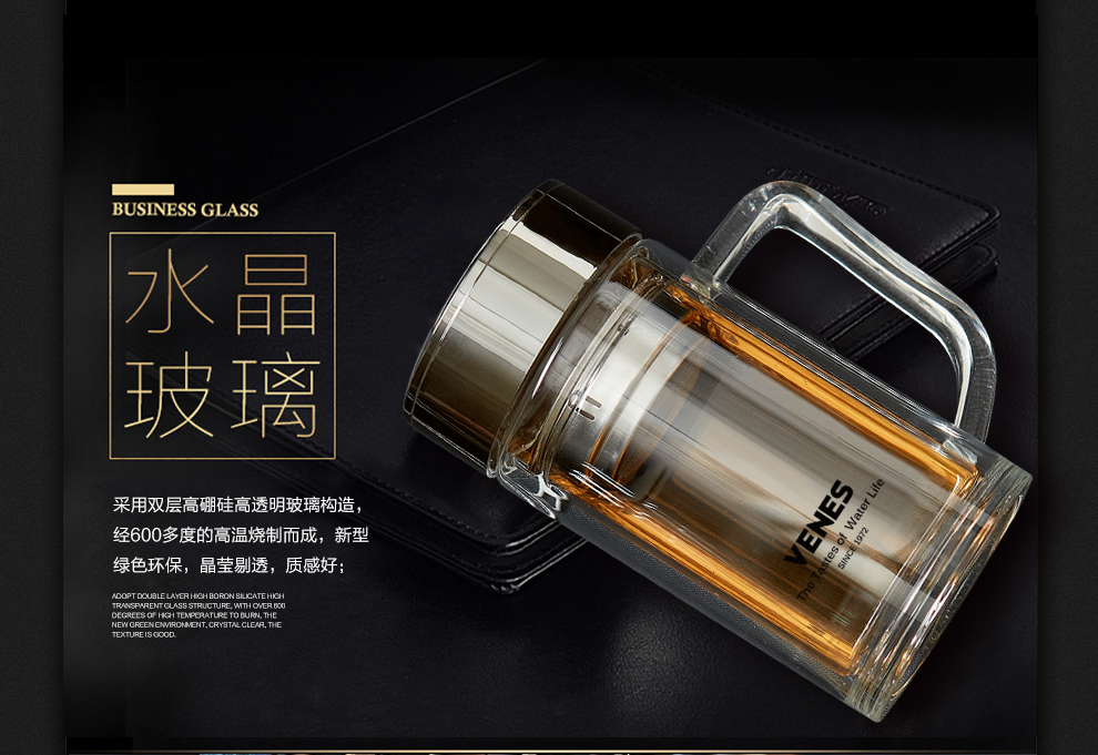 商品名称:菲驰(VENES)风范玻璃办公杯带茶隔提手双层玻璃杯350ML 礼品订制