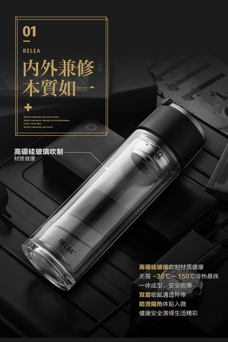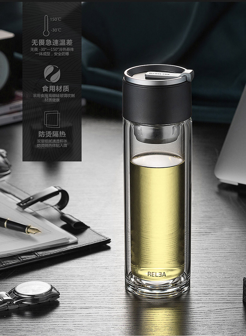 商品名称:RELEA物生物 旅行家双层玻璃杯便携带盖泡茶杯 商务员工礼品