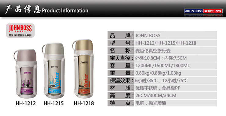 商品名称:JOHN BOSS(英国)麦哲伦真空旅行运动水壶 时尚保温壶 1.5L HH-1215 时尚实用礼品