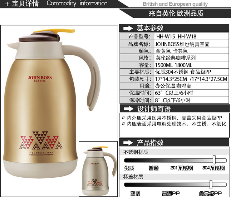 商品名称:JOHN BOSS(英国) 维也纳真空壶 保温水壶热水瓶 办公咖啡壶多用壶 1800ml 奖品 实用