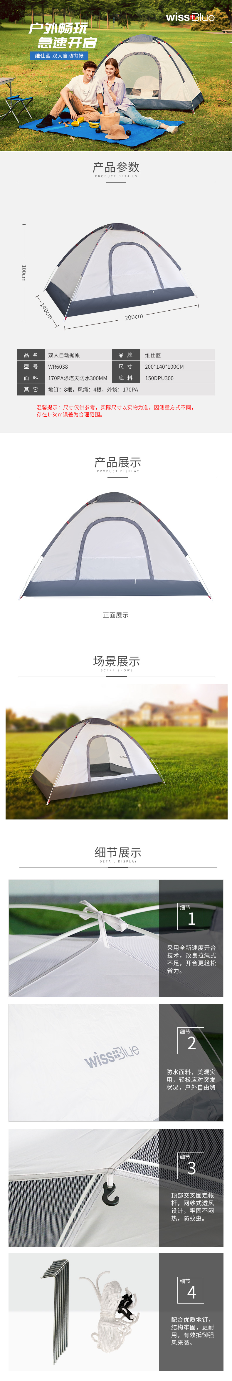 商品名称:维仕蓝(wissBlue)双人自动抛帐 灰色 生活实用小奖品