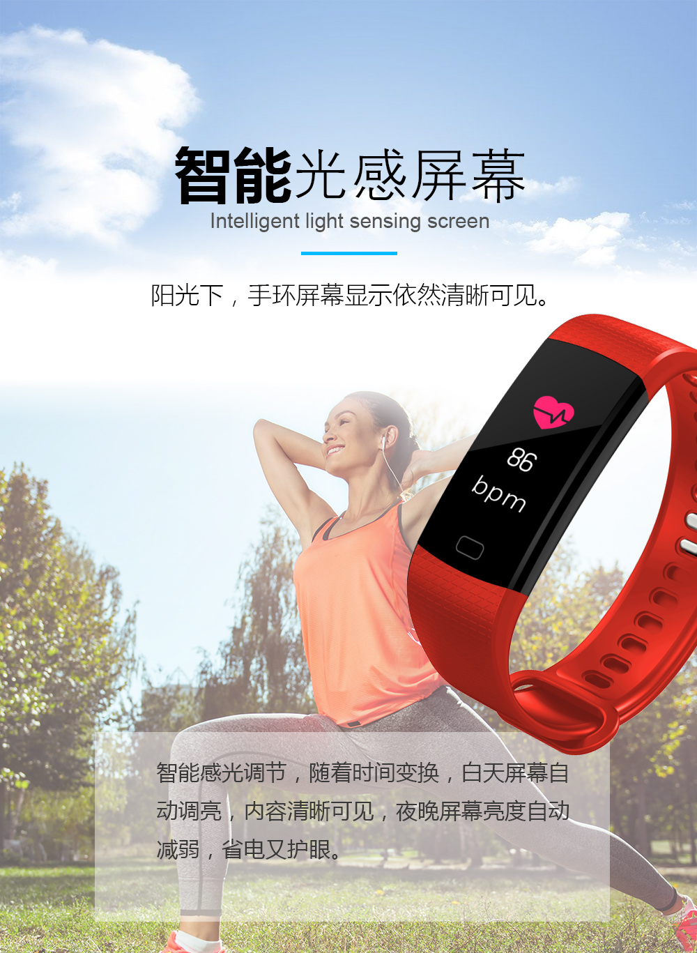 商品名称:彩屏血压心率手环 动态心率/卡路里/计步/感光屏幕运动手环 商务智能手环