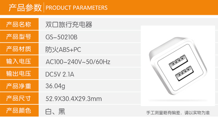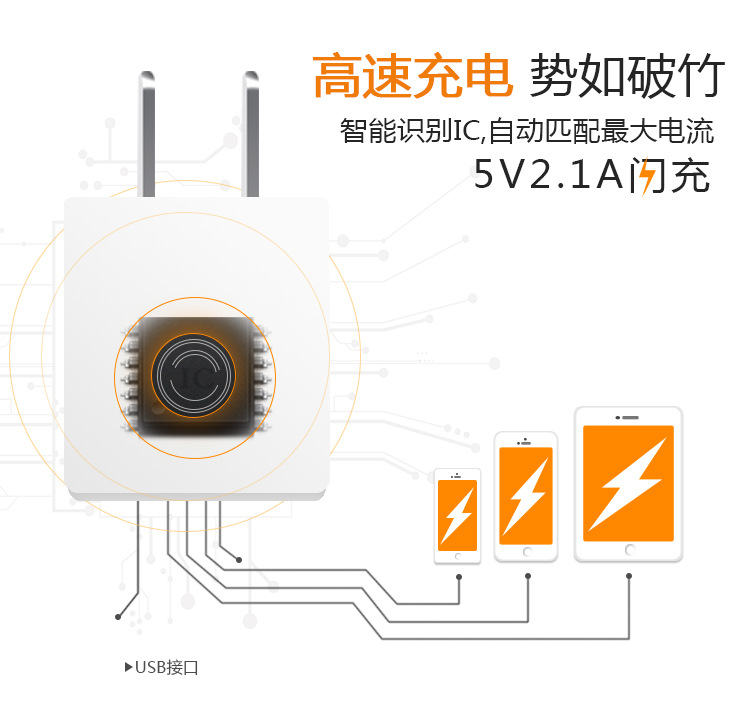 商品名称:手机平板快速充电器 5V 2.1A 智能IC识别双口数码充电头