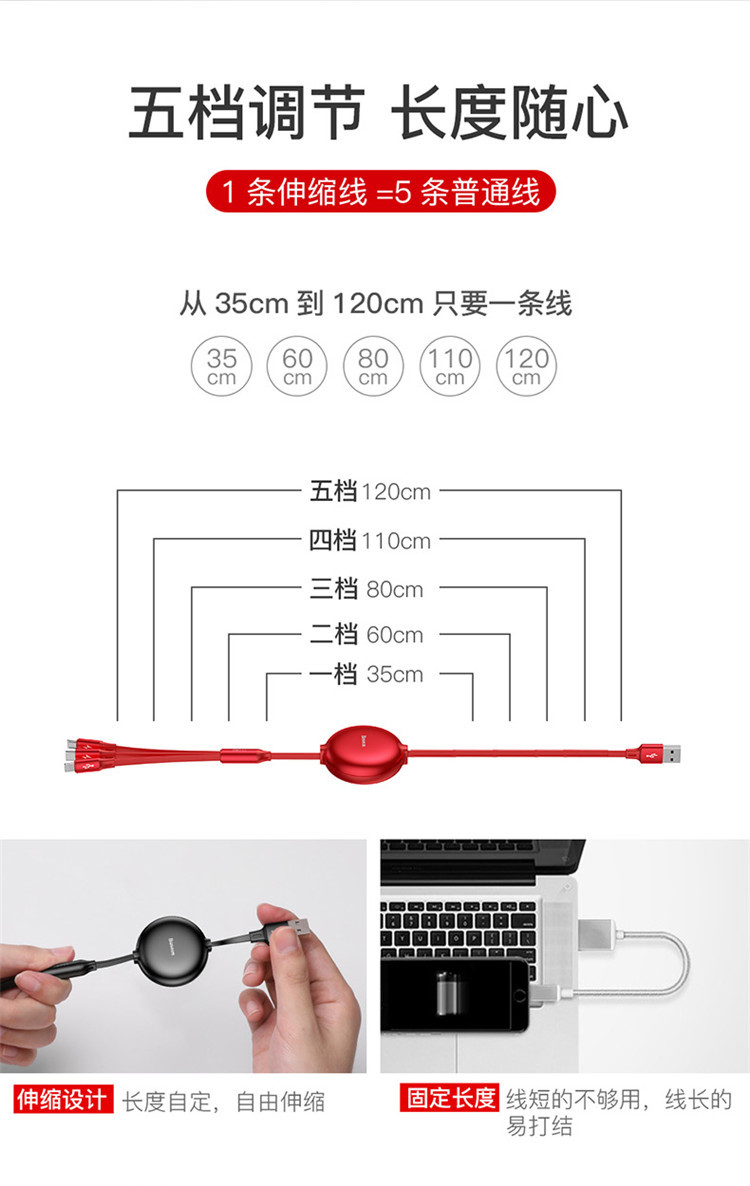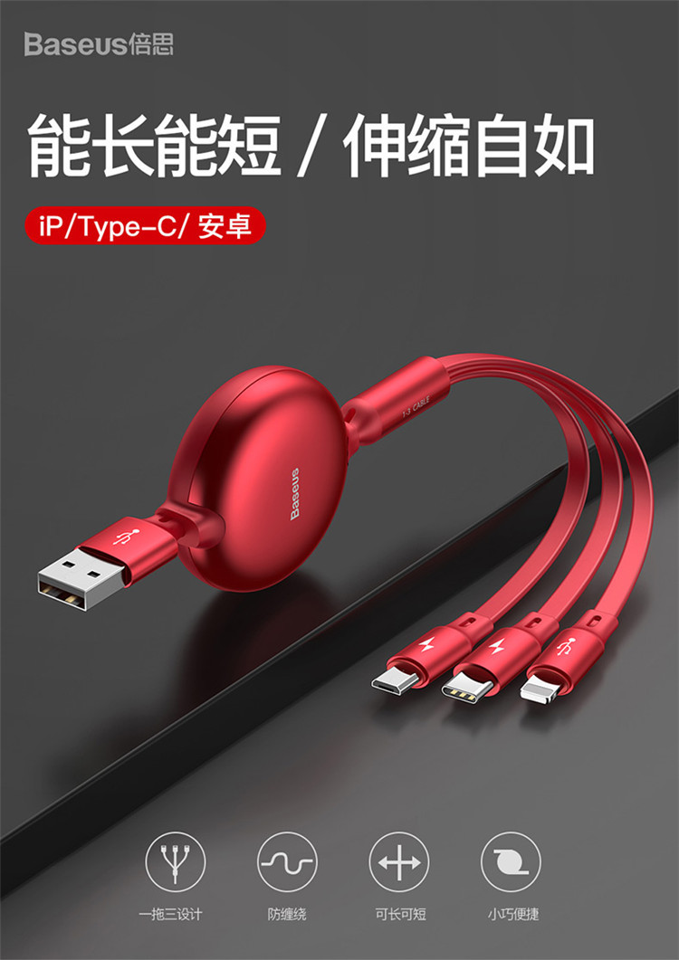 商品名称:Baseus 小章鱼手机数据线 一拖三伸缩USB通用款 到访礼品 随手礼定制