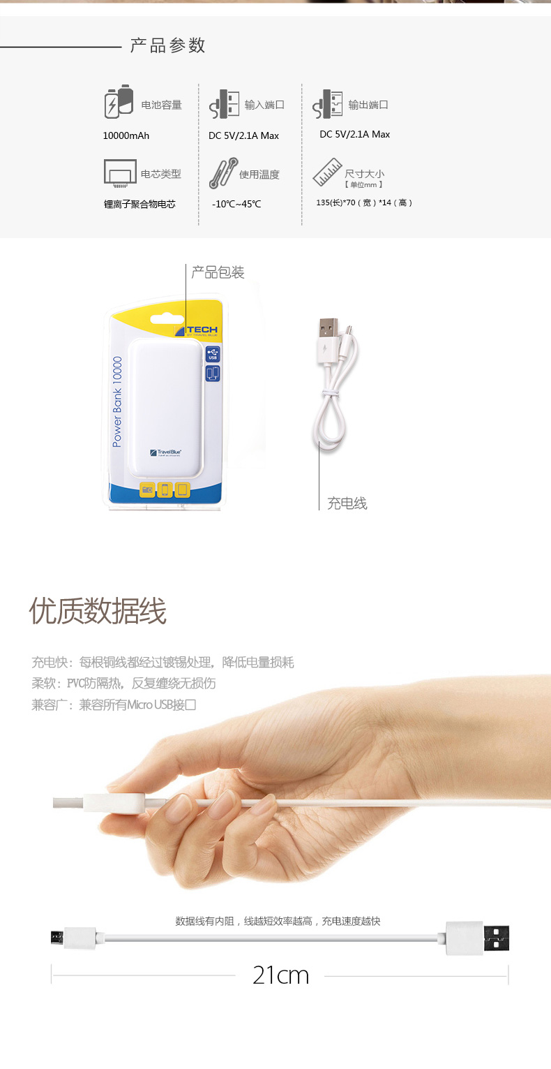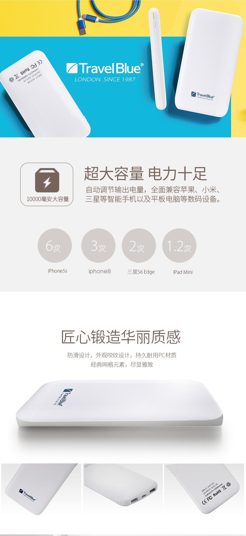 商品名称:英国蓝旅(Travel Blue)大容量移动电源 能上飞机的充电宝10000毫安