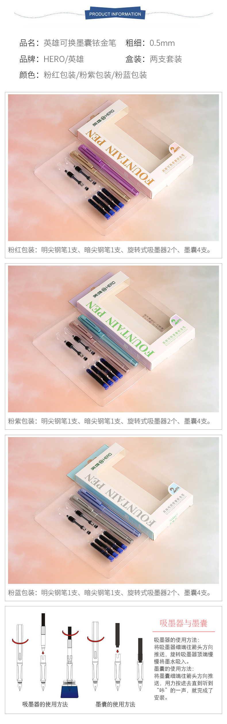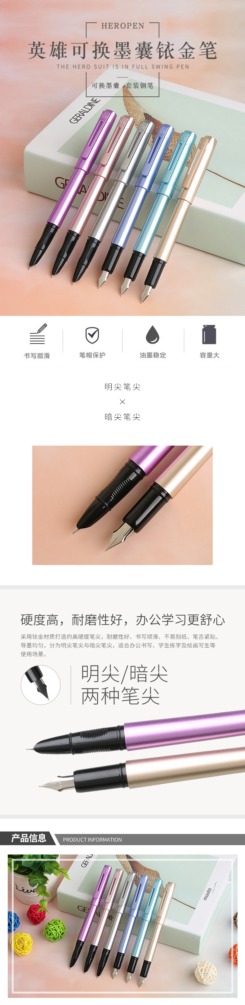 商品名称:英雄(Hero) 炫彩铱金钢笔套装 可换墨囊铱金笔 创意商务办公礼品