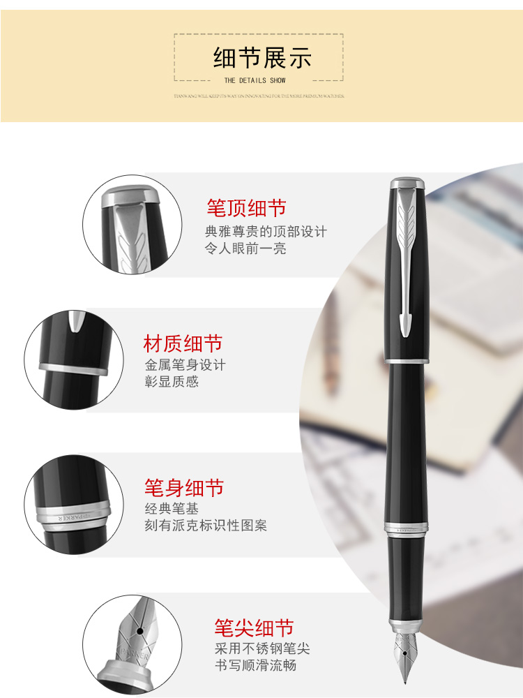 商品名称:派克PARKER 经典都市纯黑丽雅白夹墨水笔 黑色商务钢笔