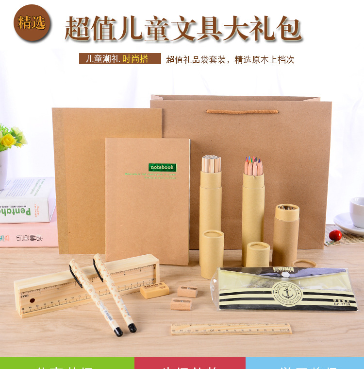商品名称:12件套超值原木文具大礼包 环保学生办公文具大礼袋
