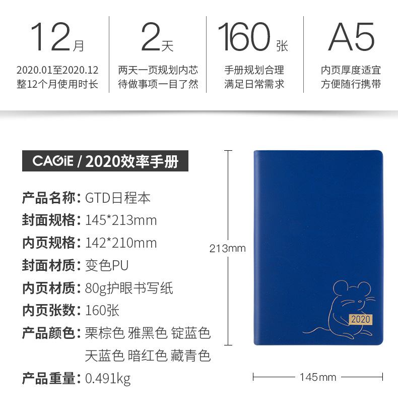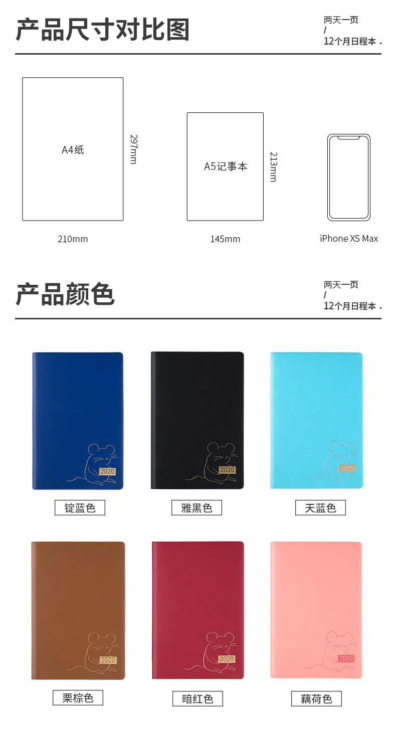 商品名称:20年鼠年先行 简约商务时尚效率手册笔记本生肖鼠日程本A5可定制logo 商务笔记本定制