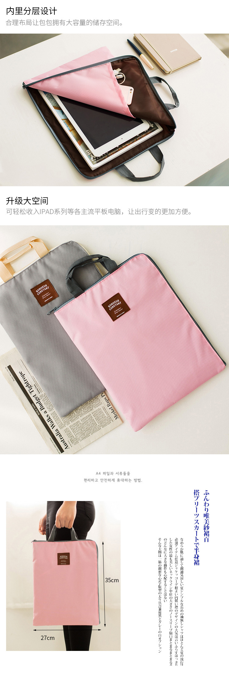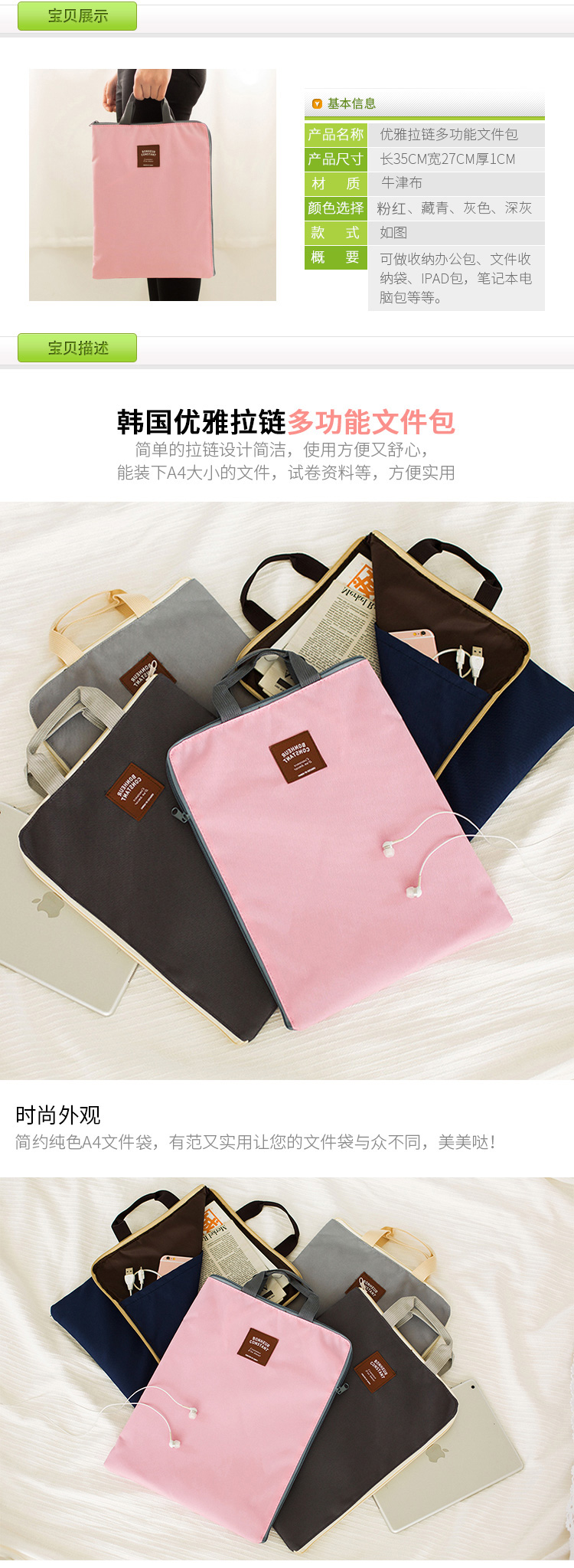 商品名称:牛津布手提带拉链A4文件包 资料袋 平板电脑收纳包--粉红色