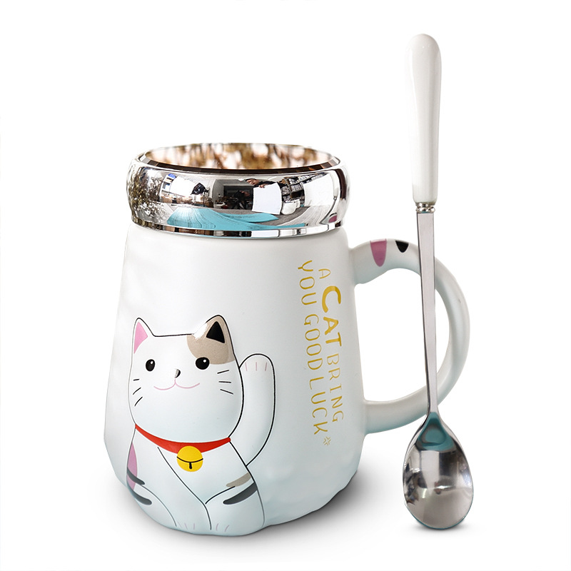 招财猫卡通陶瓷杯 带镜面盖带勺大容量浮雕杯子500ML 开业送什么东西好