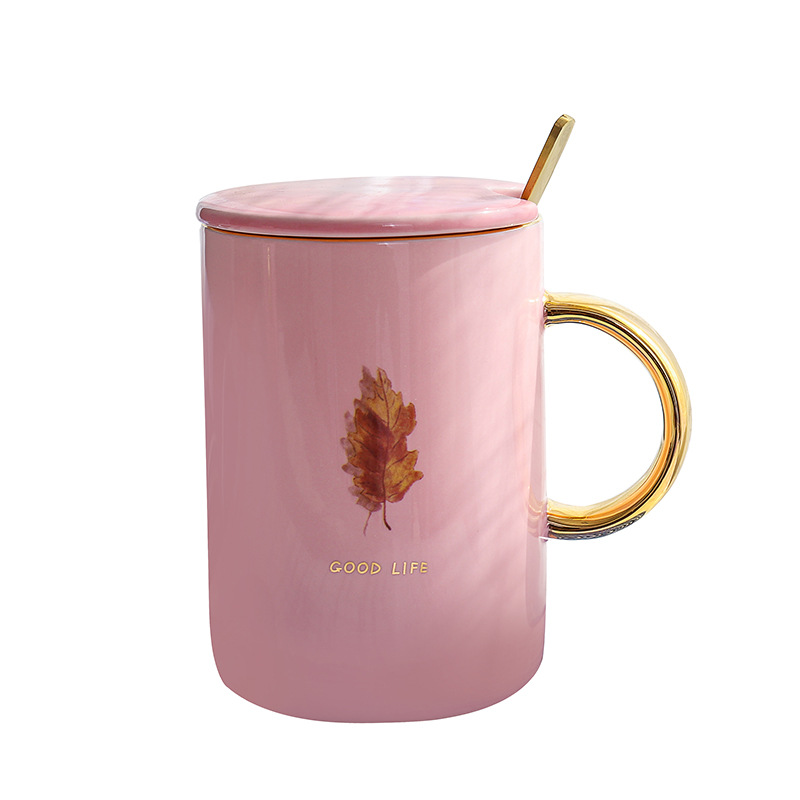 Good Life 粉色系描金带盖带勺商务马克杯 咖啡牛奶杯 适合销售人员的礼品