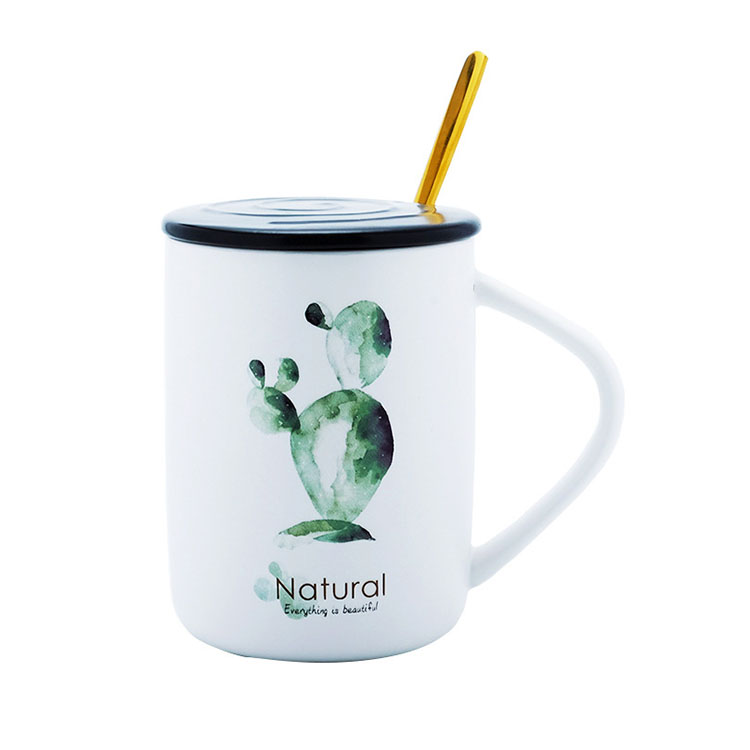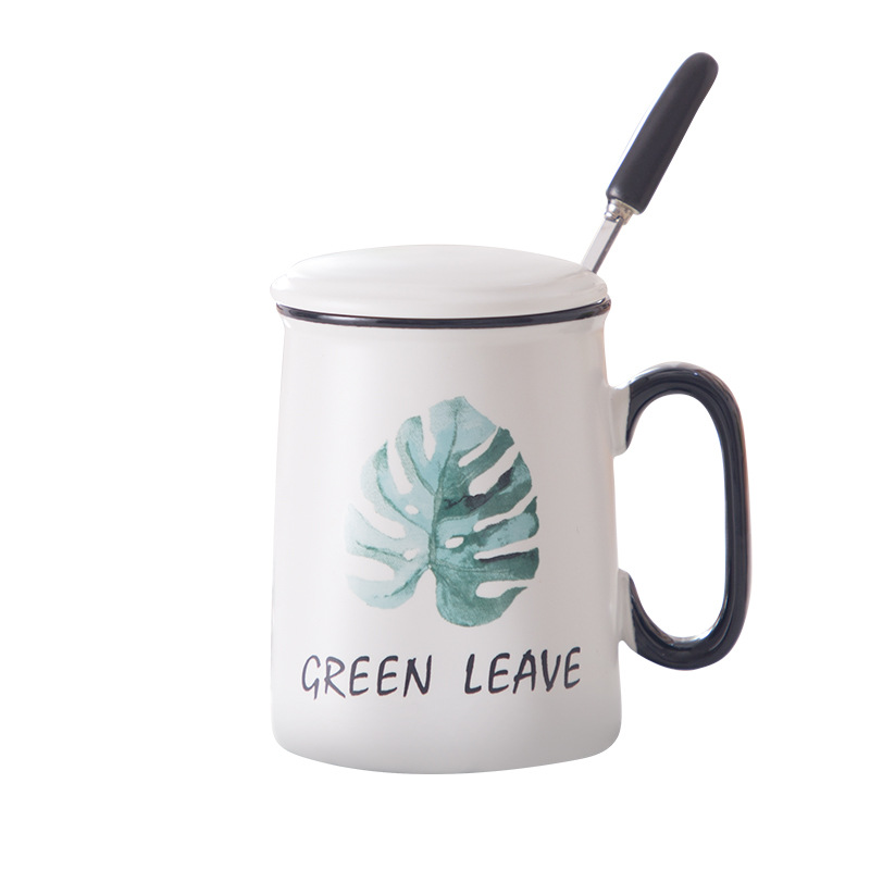 简约自然绿植树叶陶瓷杯 马克杯带盖带勺 400ml 活动创意小礼品