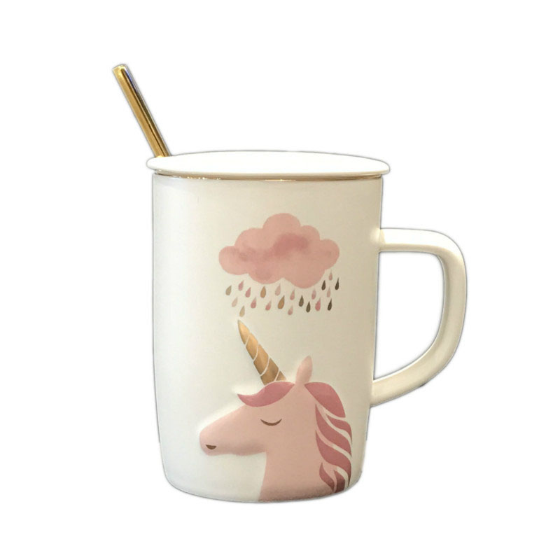 卡通独角兽陶瓷杯带盖勺浮雕图案马克杯办公水杯 促销小赠品