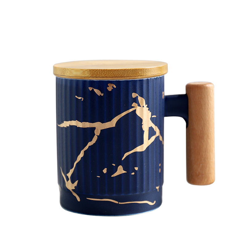 北欧风大理石纹带盖木柄商务办公室简约陶瓷杯 个性礼品
