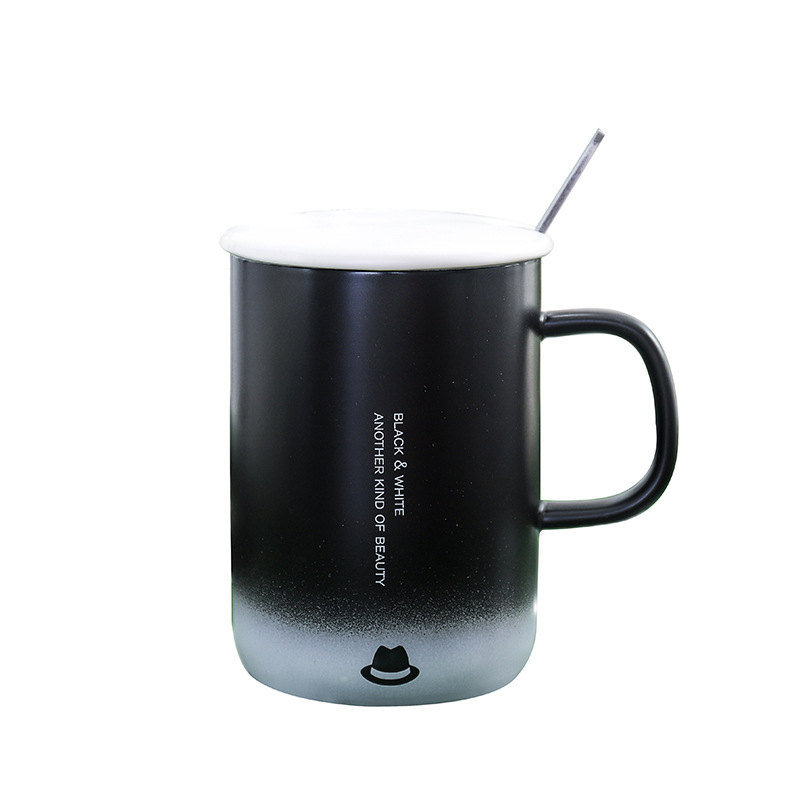磨砂黑白渐变带盖带勺陶瓷杯带盖马克杯定制 员工活动奖品