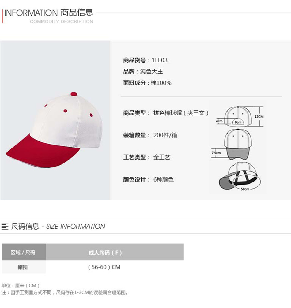 商品名称:纯棉棒球帽定制 夹三文拼色棒球帽定做 礼品定制厂家