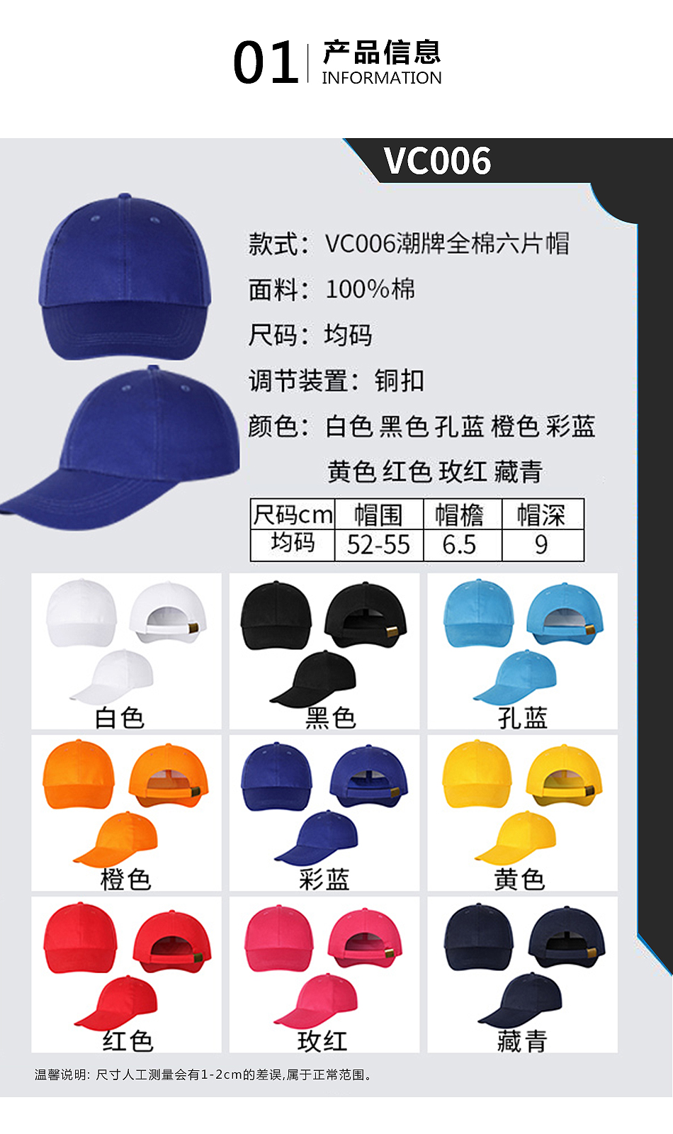 商品名称:潮牌广告帽定制 全棉六片帽定做 联欢会小礼品