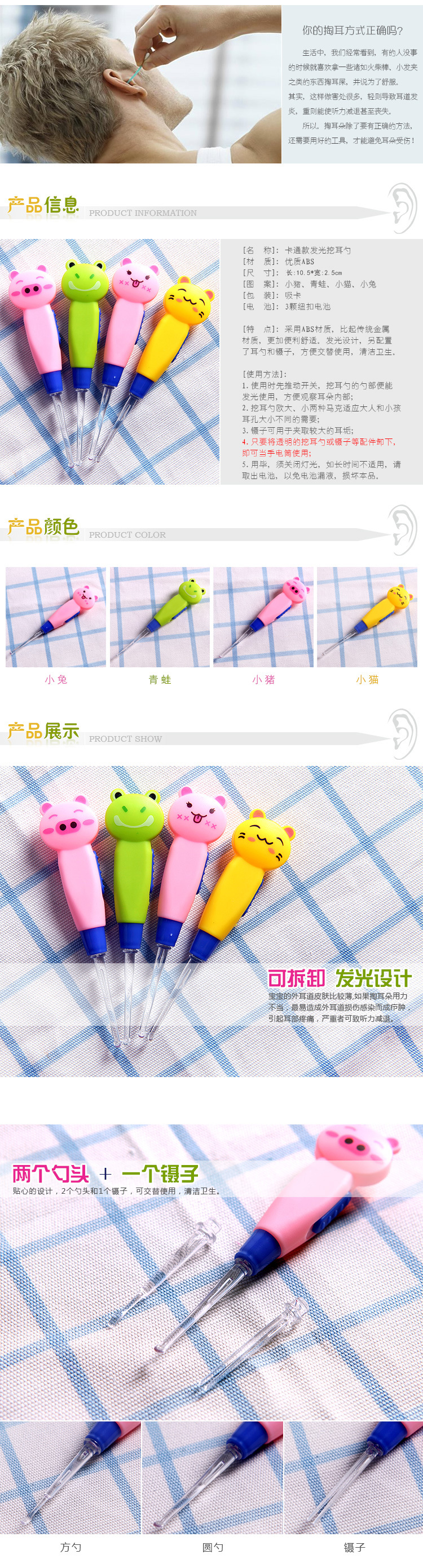 商品名称:小猫卡通动物发光可拆卸配3头耳勺 可爱耳勺