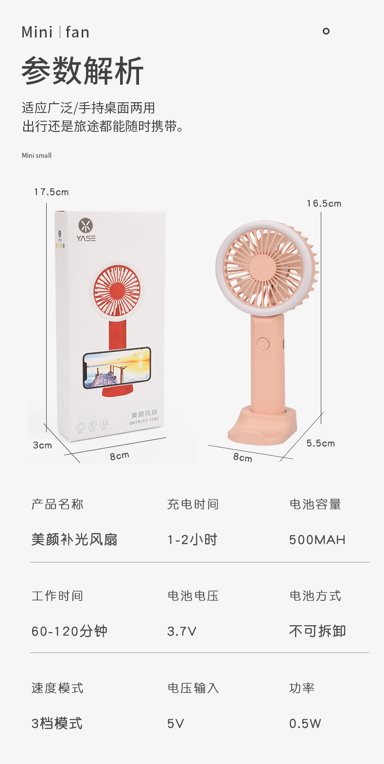商品名称:多功能手持小风扇 美颜补光风扇 手机支架桌面风扇 活动奖品定制