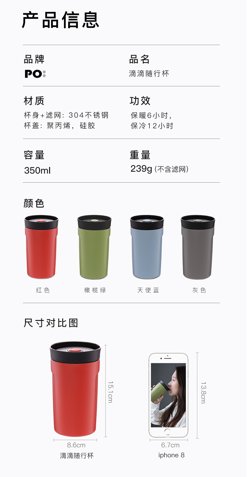 商品名称:丹麦PO 北欧滴滴随行咖啡杯 便携车载水杯双层保冷保温时尚大容量杯350ML 年度抽奖奖品