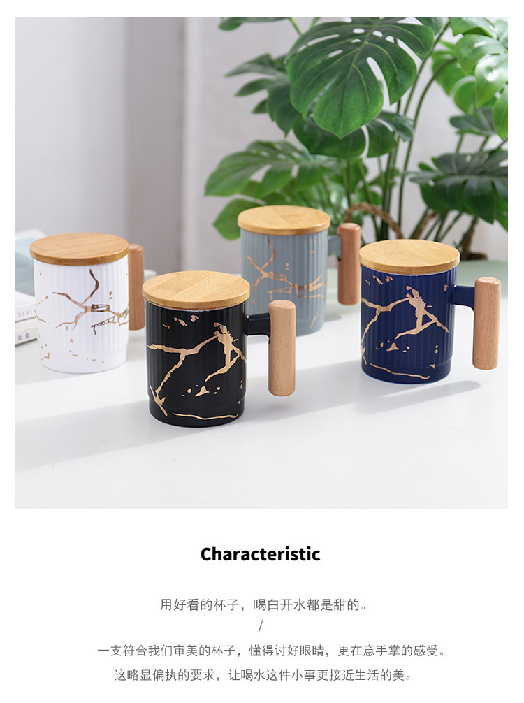 商品名称:北欧风大理石纹带盖木柄商务办公室简约陶瓷杯 个性礼品