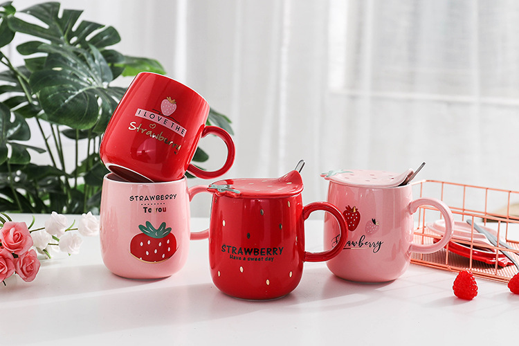 韩式粉色系草莓卡通可爱带盖带勺创意咖啡水杯 送职员的礼品,什么比较合适