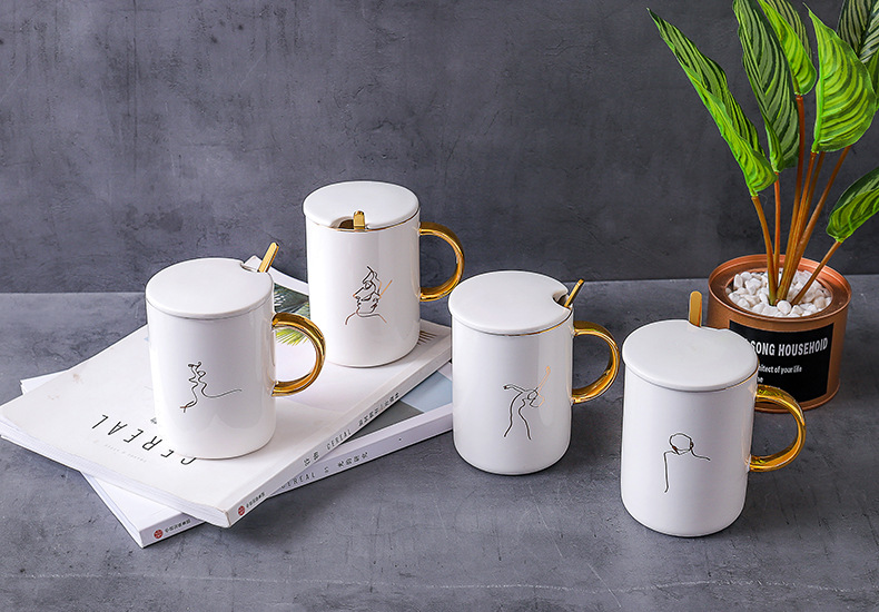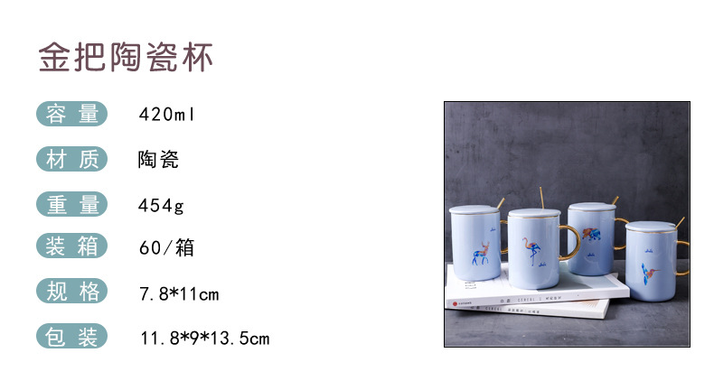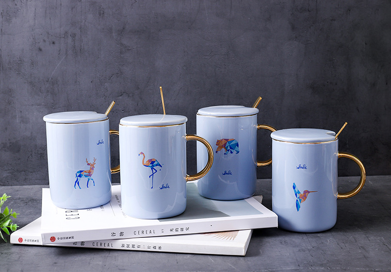 商品名称:北欧INS风简约描金 风景 动物陶瓷马克杯定制 带盖带勺咖啡杯 政府职员小礼品