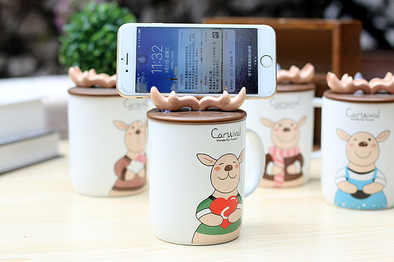 创意鹿角手机支架杯子带盖带勺 个性礼品