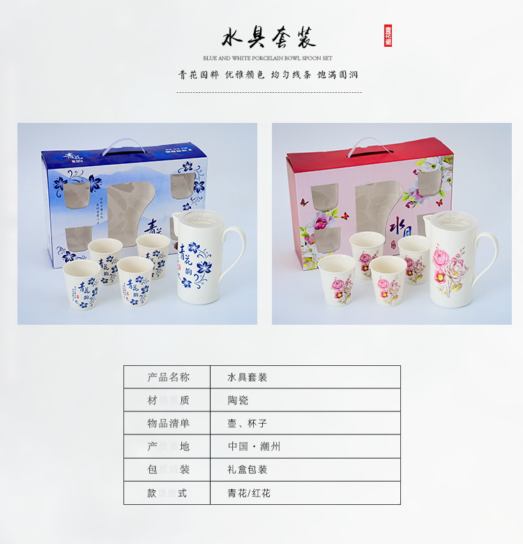 商品名称:青花瓷水具套装 一壶四杯陶瓷茶具五件套 定制礼品 创意
