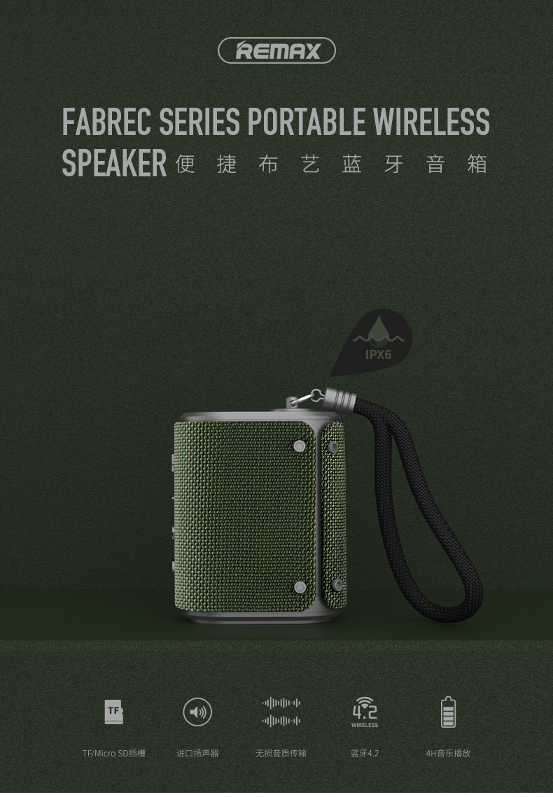商品名称:REMAX 便携布艺蓝牙防水音箱 户外迷你手机音响 便携式小音箱 炫酷创意礼品 科技礼品定制