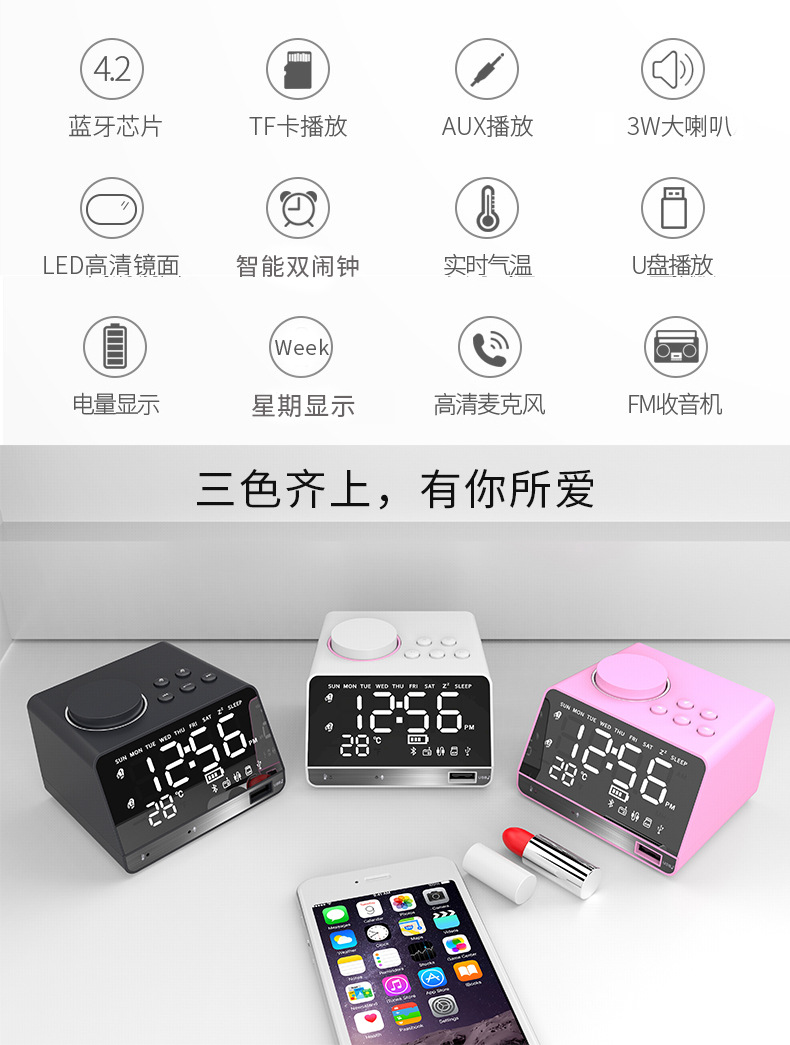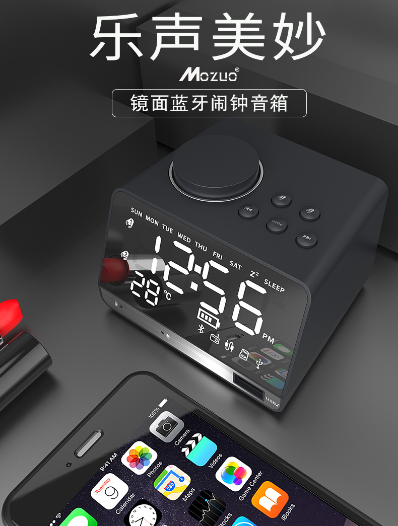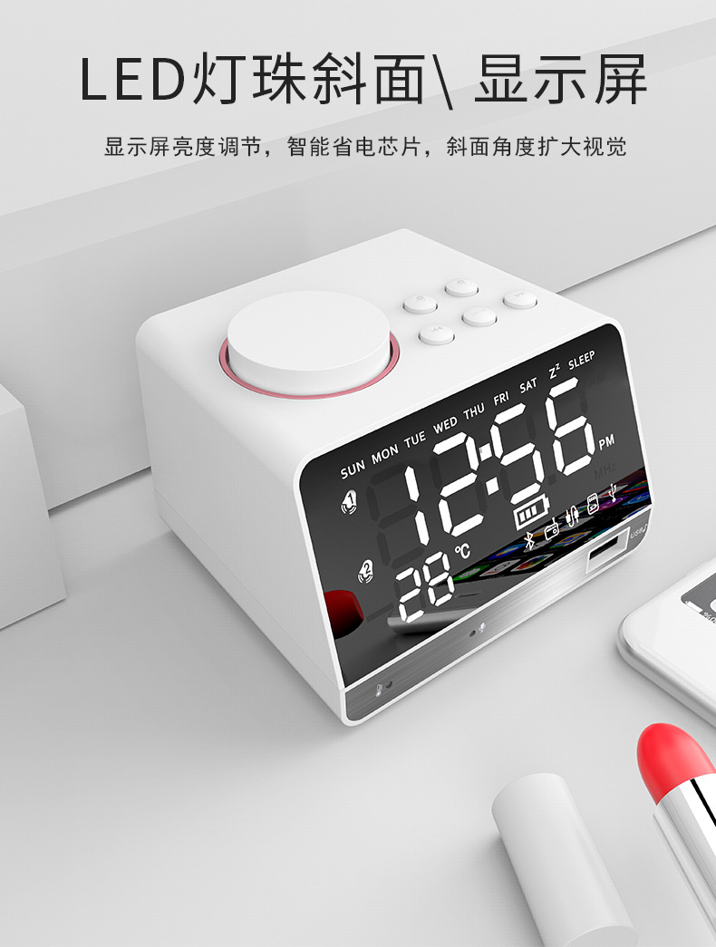 商品名称:无线蓝牙斜镜面闹钟音箱 多功能桌面气温日期显示音响收音机 科技礼品定制