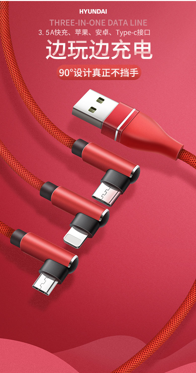 商品名称:HYUNDAI/现代 一拖三弯头3.5A快充苹果安卓数据线通用 不挡手创意设计快充线 环保奖品 促销礼品定制