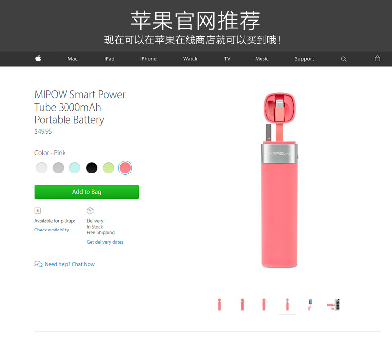 Power Tube便携智能移动电源 苹果认证 时尚小巧充电宝 3000毫安