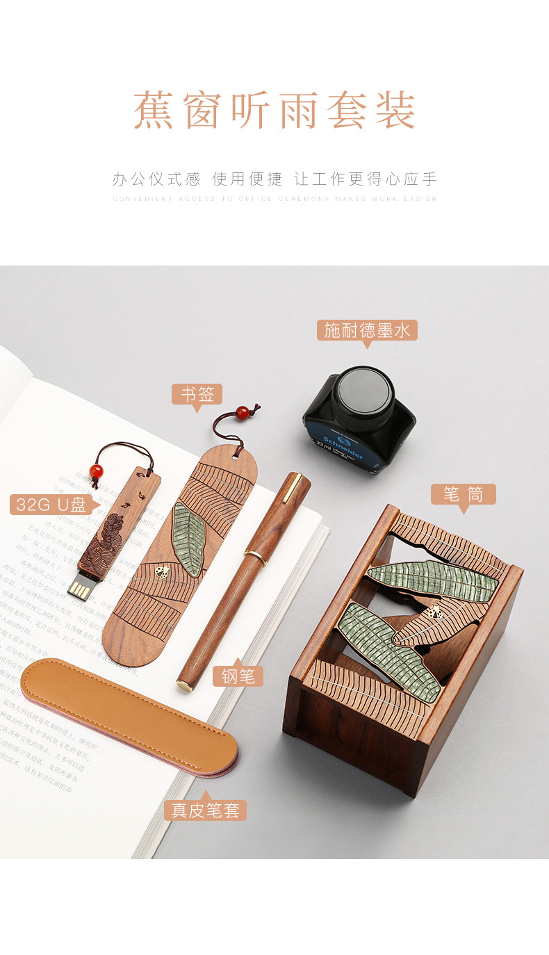 蕉窗听雨套装 笔筒+钢笔+书签+笔套+墨水+32GU盘 会议纪念礼品