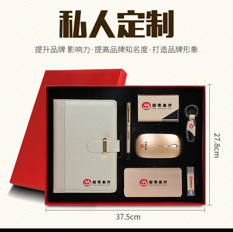 商品名称:A5格调笔记本+鼠标+充电宝+8G两用手机U盘+签字笔+名片夹+钥匙扣组合礼盒 实用办公七件套 年会礼品定制